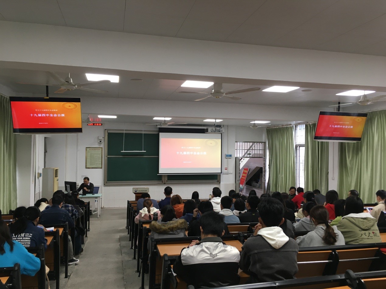 为了认真贯彻落实十九届四中全会精神,继续推进“不忘初心、牢记使命”主题教育,提高主题教育质量,提高党员队伍的理论水平和党组织的创造力、凝聚力和战斗力,11月28日中午,计算机系党总支在计算机楼101开展第四期党课培训。党总支书记金秀岩同志带领计算机系师生党员、入党积极分子共计90余人共同学习了《十九届四中全会公报》(以下简称“公报”)。