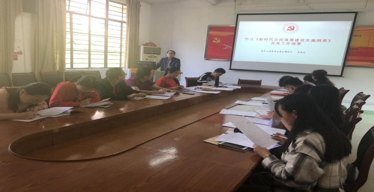 罗远宁传达学习《新时代公民道德建设实施纲要》精神,并做了支部开展学习《纲要》的工作部署。他从《纲要》实施的背景及其意义、总体要求、重点任务和具体措施四个方面向全体师生做了详细的介绍,并要求各位党员教师通过主题班会、签定倡议书、广泛开展线上线下宣传活动等方式面向全体学生开展学习活动,确保学习效果,通过对纲要的学习在系部形成良好的道德氛围。