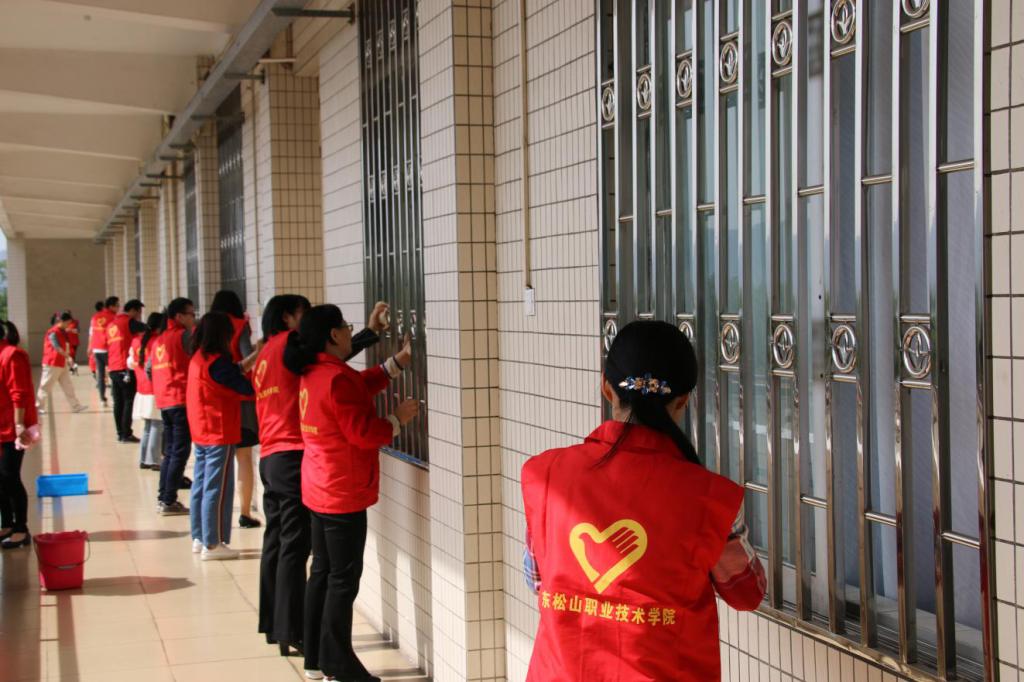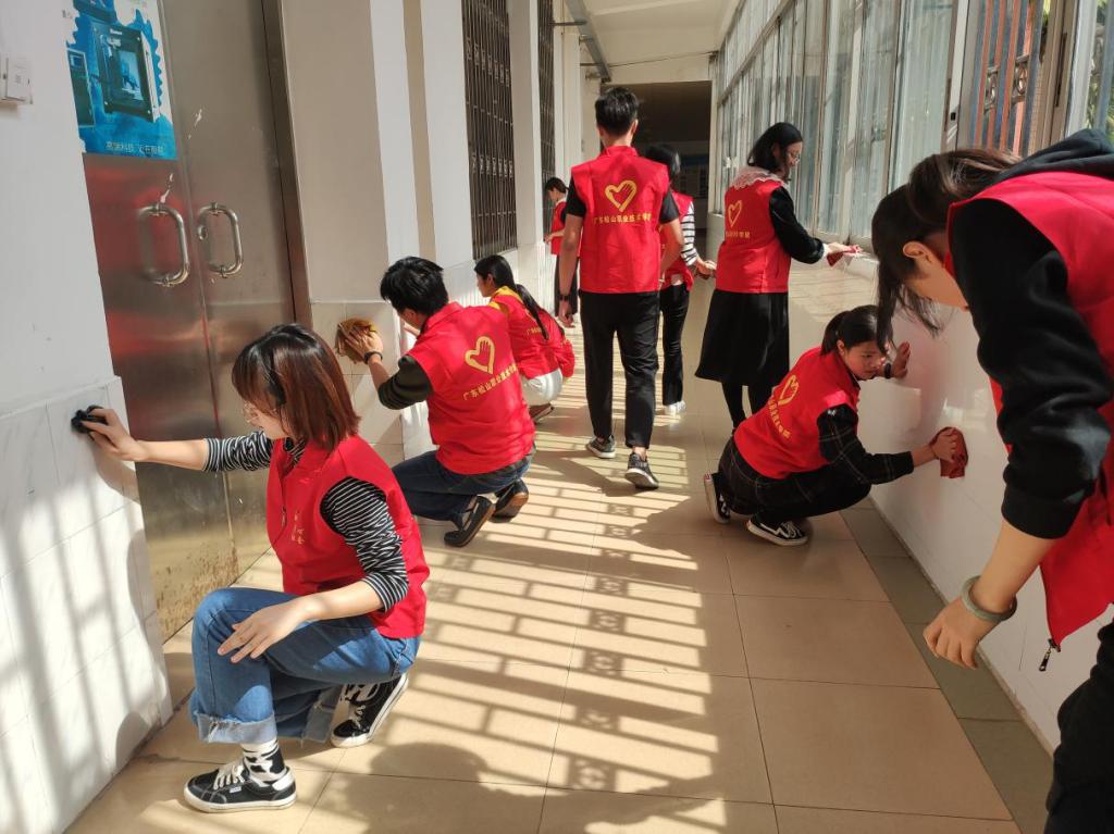 志愿者们不怕脏、不怕累,利用中午休息时间将宽字楼走廊及楼梯间的卫生墙全部擦拭了一遍,为师生提供了一个更加舒适的教学环境。