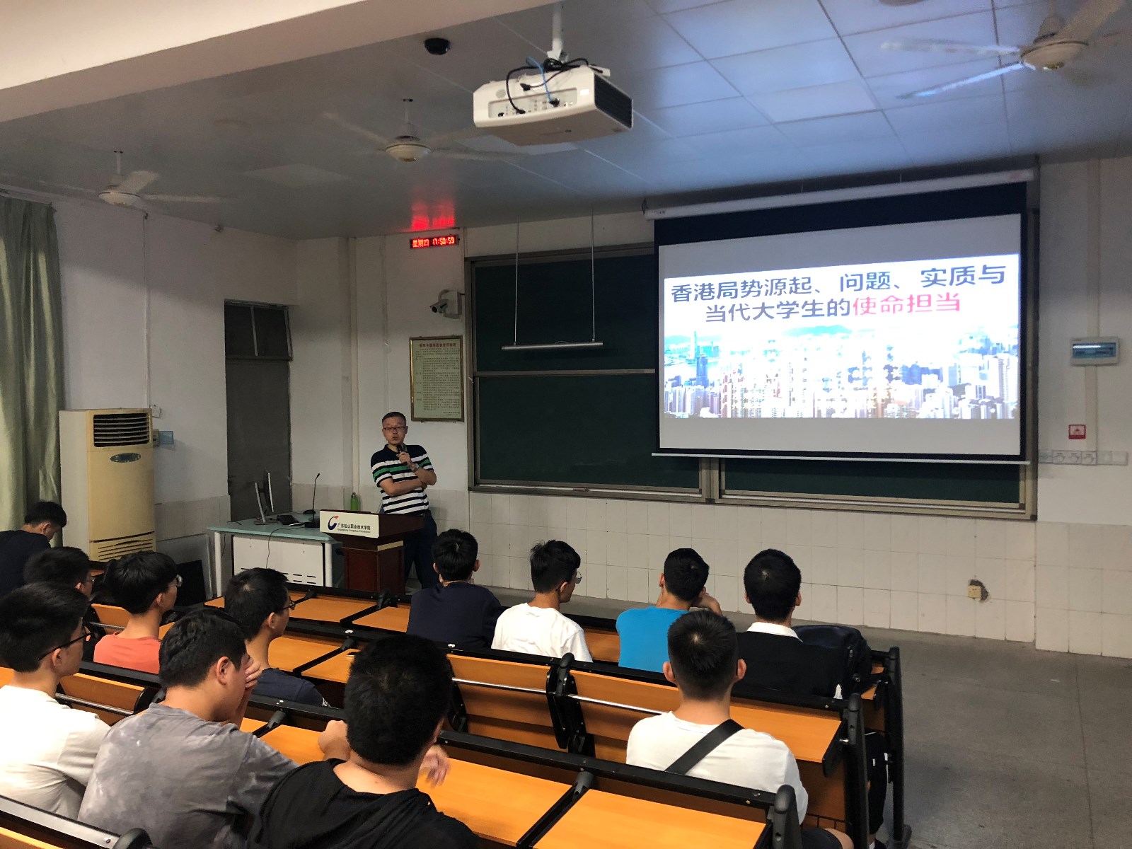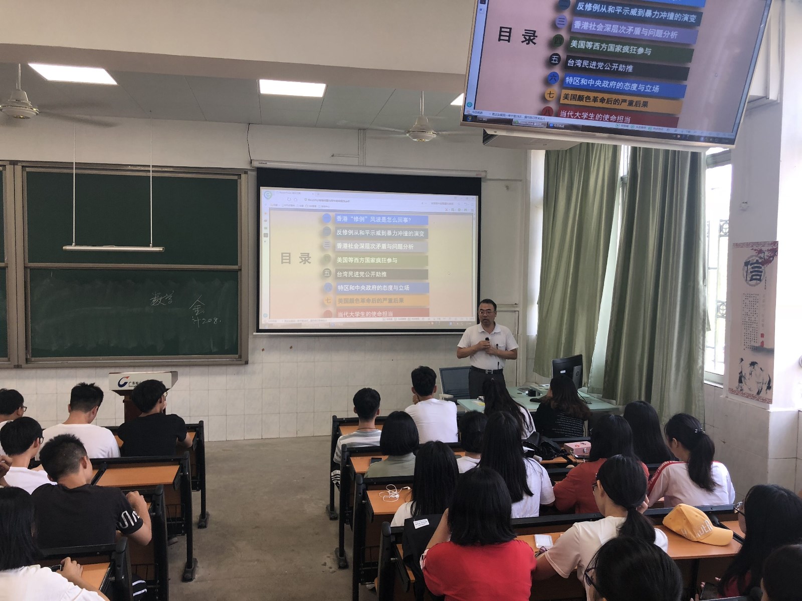 10月9日、12日,计算机系总支书记金秀岩、主任胡开明为2019级计算机应用技术、室内艺术设计等8个专业300多名新生,结合“不忘初心、牢记使命”主题教育,以《香港问题与青年使命担当》为主题上了开学第一课。