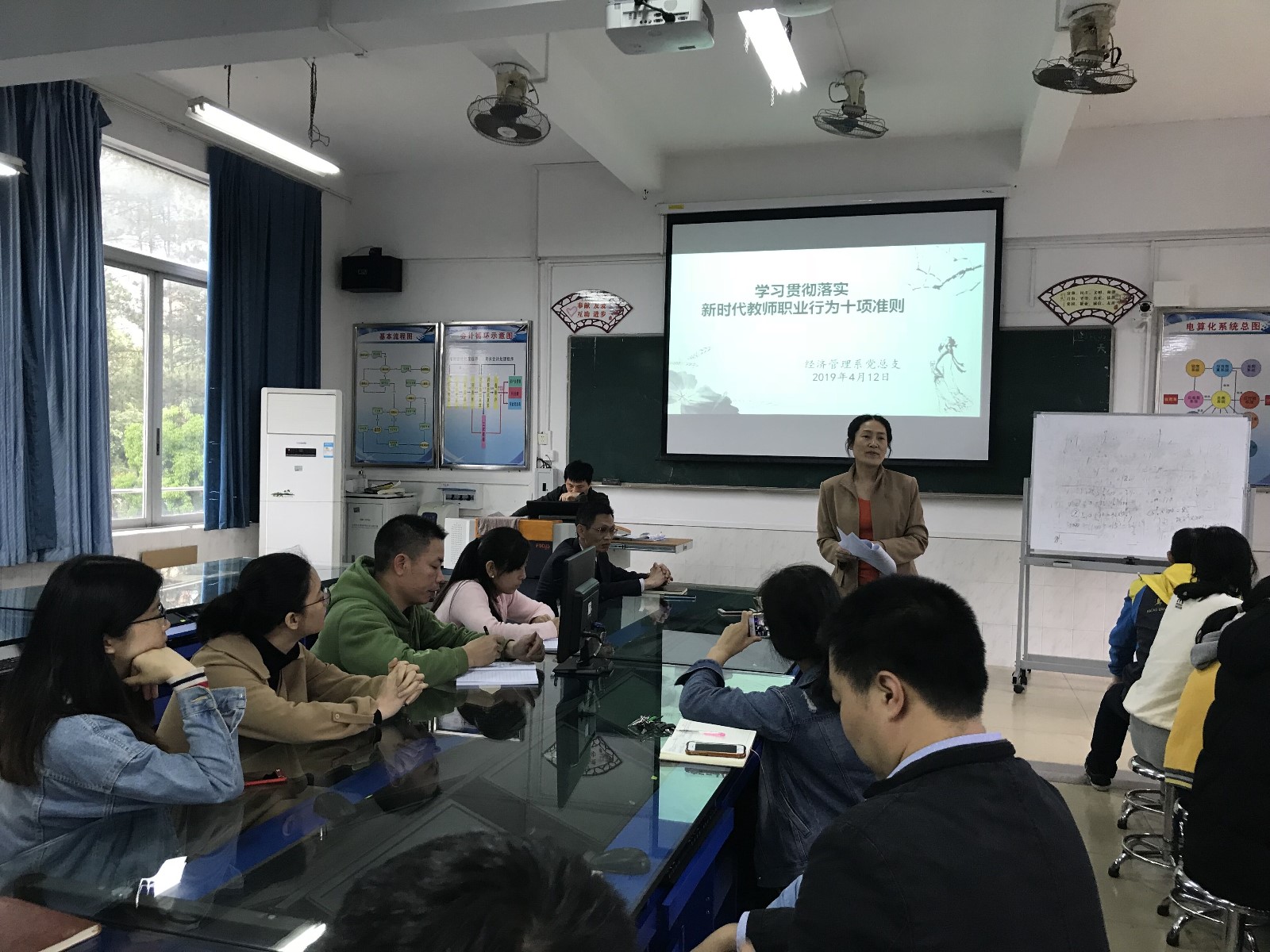 为进一步加强师德师风建设,贯彻落实新时代教师职业行为十项准则,4月12日,经济管理系党总支组织全系教师集中学习了《新时代高校教师职业行为十项准则》,学习活动由系党总支书记熊琼华主持。