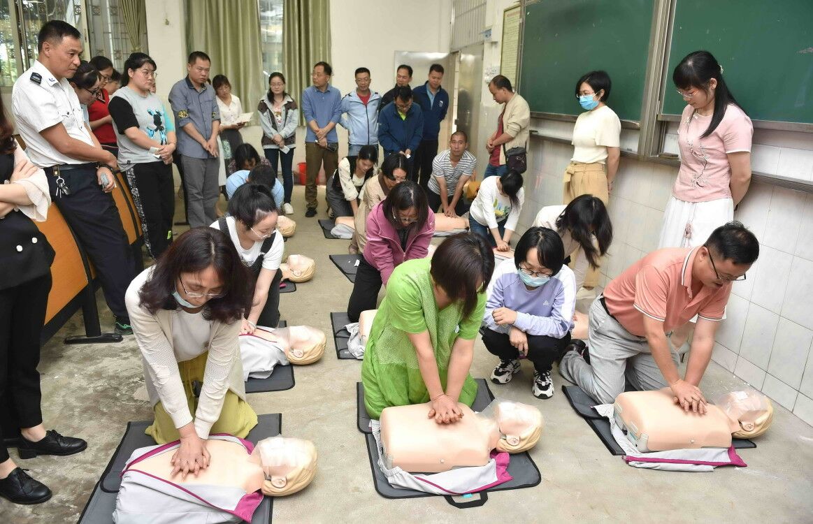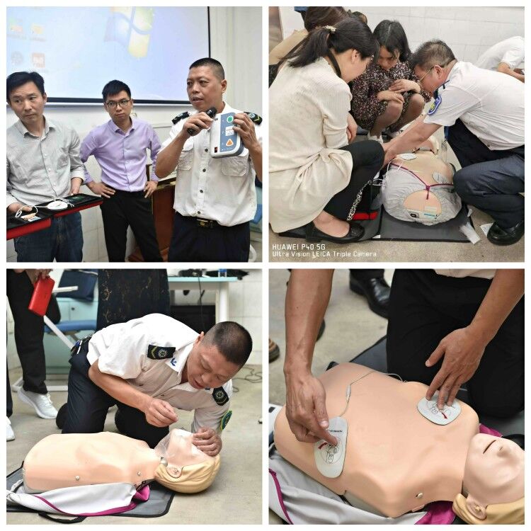 培训现场,邓光辉结合一个个生动真实的案例,详细地为教职工们讲解了专业的自救互救基本知识和技能。在心肺复苏模拟实践操作环节中,林艺景对相关操作要领作了现场示范。教职工们热情高涨,并在4位专家的指导下分批进行了胸外按压、人工呼吸、电击除颤等操作训练。