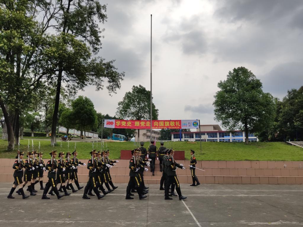 升旗仪式上,我校气宇轩昂的国旗护卫队身着整齐的服装,迈着铿锵有力的步伐护送国旗,伴随着在场300多名师生崇敬的目光,五星红旗在雄壮的《义勇军进行曲》中冉冉升起。我校国旗护卫队、退役复学学生用自己的方式展示了爱国主义、崇军尚武的情怀,以真挚的情感、朴素的情怀和实际行动为中国共产党建党100周年献礼。