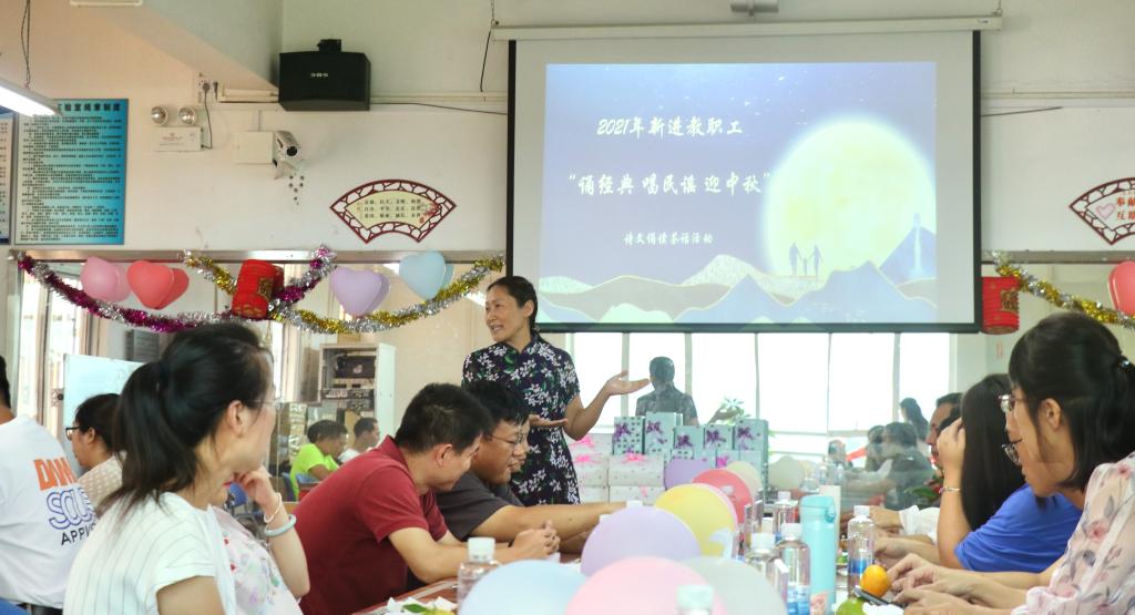 “海上生明月,天涯共此时。”在一年一度的中秋佳节来临之际,为使我校新进教职工在“团圆、和谐”美好寓意的中国优秀传统文化节日里,在感悟和合文化中,认识新同事,结交新朋友,增进友爱,融入“松山家园”,9月17日下午,校工会在宽B506开展了“诵经典 唱民谣 迎中秋”诗文诵读茶话活动。本次活动有近40名新进教职工参加,校工会副主席熊琼华出席了活动。