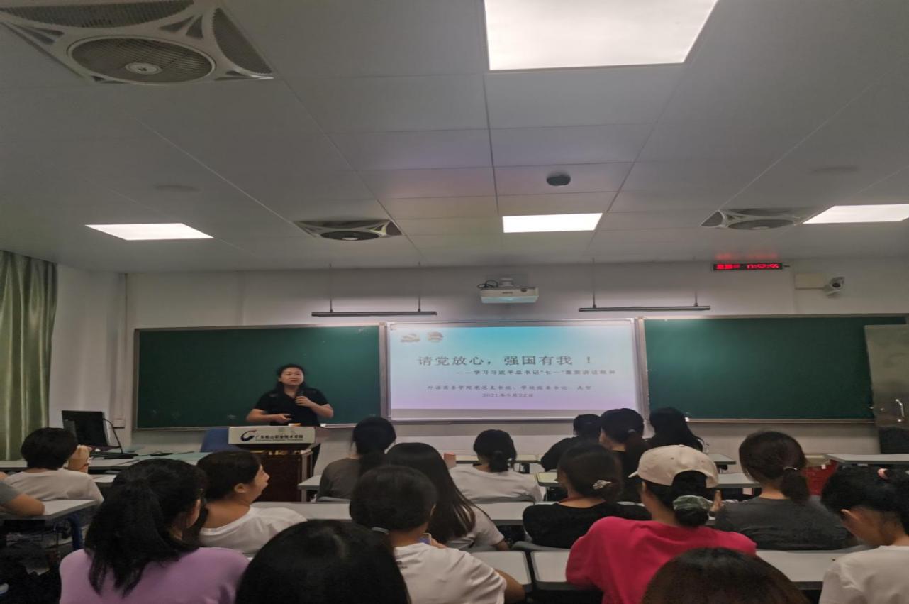 9月22日晚,外语商务学院党总支书记、校团委书记高贺于厚B302为外语商务学院85名学生讲授题为《“请党放心,强国有我”——学习习近平总书记“七一”重要讲话精神》的“思政第一课”。