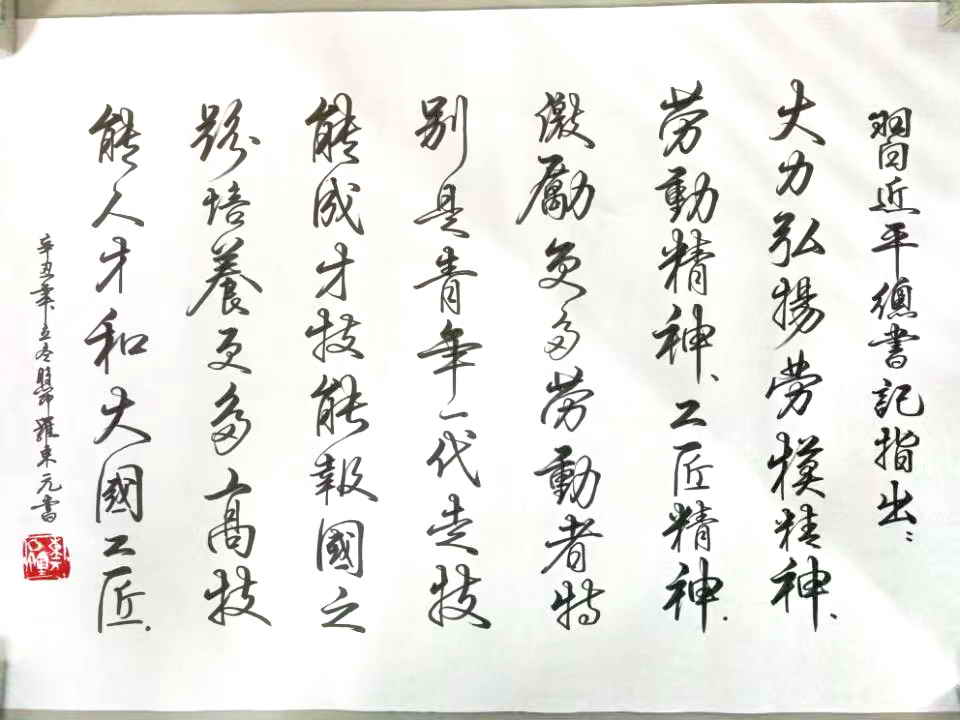 为勉励同学们发扬优良传统、弘扬劳模精神、工匠精神,罗东元还专门执笔泼墨,将习近平总书记相关重要讲话写成一幅书法作品,赠送给我校青年学子们。
