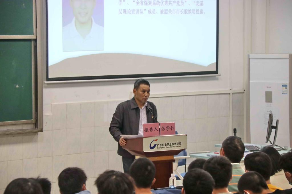 张学仁以“传承红色基因,弘扬工矿精神,奋进新征程”为题,以庆祝中国共产党成立100周年“七一勋章”颁授仪式及庆祝中国共产党成立100周年大会上习近平总书记重要讲话为切入点,围绕党史学习教育、韶关工矿精神、广东曲仁矿务局的创业发展史以及个人成长历程,用纪实的故事、翔实的数据,讲述了新中国成立以来曲仁矿务局攻艰克难的发展历程。作为一名“矿二代”,他向在场师生分享了个人先进事迹以及作为一名老共产党员对学习党史的感悟。张学仁勉励青年学子珍惜当下,不负青春、不负韶华,努力奋斗,用习近平新时代中国特色社会主义思想武装头脑,砥砺前行,争作大国工匠、国家栋梁。