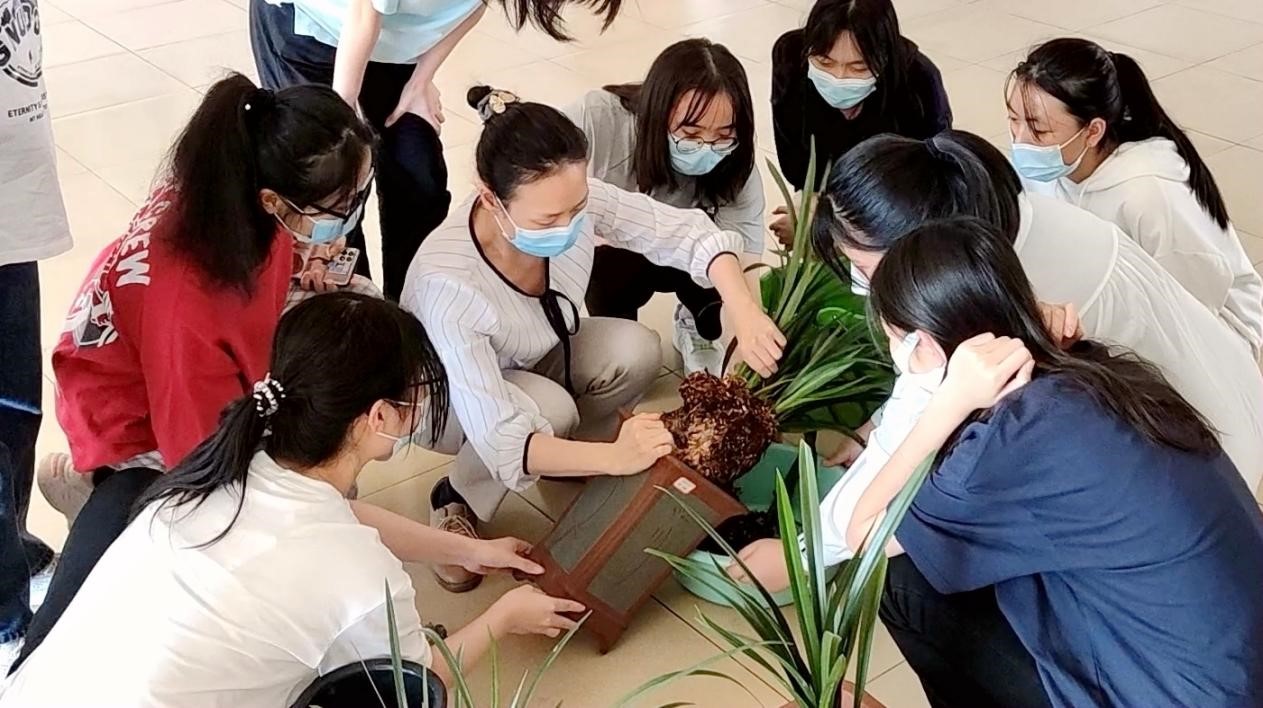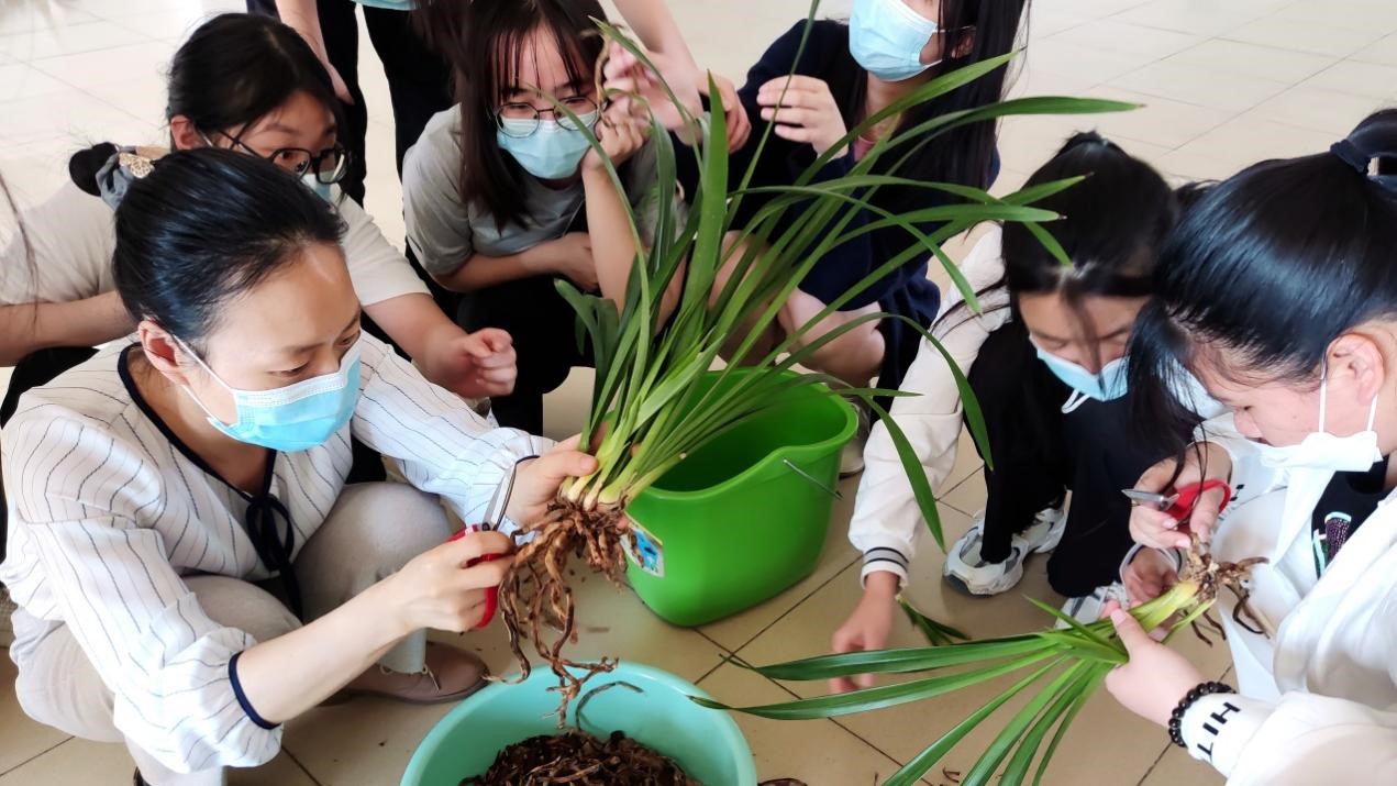 在2021级电子商务专业《兰花文化与营销》的课堂上,樊琛老师正在向同学们传授兰花的分苗技巧:“要想兰花长得更加旺盛,更容易来芽来花,就要对已经长爆盆的兰花进行分苗。兰花在一年当中有春、秋两个生长发育旺盛期,现在正值二十四节气中的谷雨时节,我们可以通过将这盆多株的兰花进行分苗,促进新芽萌发生长。分苗可以使兰花一盆变两盆,分盆后的兰花获得更充足的生长空间和养分,这也是兰农通过种植脱贫致富的密码。”同学们一边看着樊老师演示如何对兰花进行分苗,一边自己动手实践,劳动的乐趣写满了每个人的脸庞。