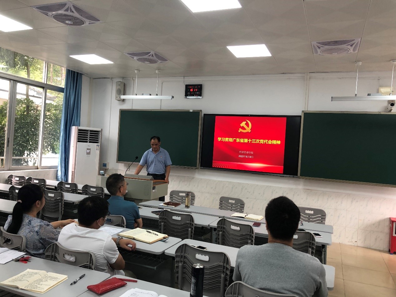 6月9日下午,经济管理学院在宽B203组织全院教职工专题学习贯彻广东省第十三次党代会精神,会议由党总支书记李凤标主持。