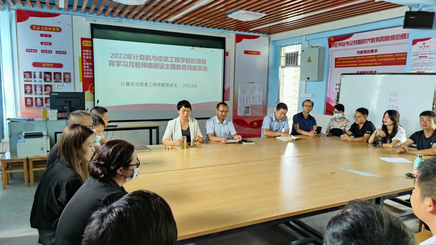 为深入学习习近平新时代中国特色社会主义思想,贯彻落实纪律教育学习月与师德建设主题教育月活动文件要求,推动学院高质量发展,9月9日,计算机与信息工程学院召开纪律教育学习月暨师德建设主题教育月动员会,会议由学院党总支书记刘攀桂主持,院长王玉贤、副院长崔炜及学院全体教职员工参加会议。