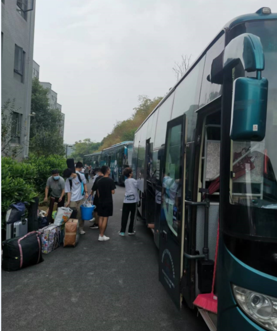 搬迁过程中,辅导员老师和学生组成志愿服务队,在搬迁两地做好协调接应工作,认真核对清单,搬运行李上下车,奔跑在楼上楼下,体现了志愿服务队的责任感和凝聚力,搬迁效率大大提高,得到了同学们的肯定。为了做好疫情防控工作,刚搬到产业学院宿舍的学生顾不上收拾行李,迅速乘坐大巴车到附近核酸检测采集点进行核酸检测,确保防疫安全。