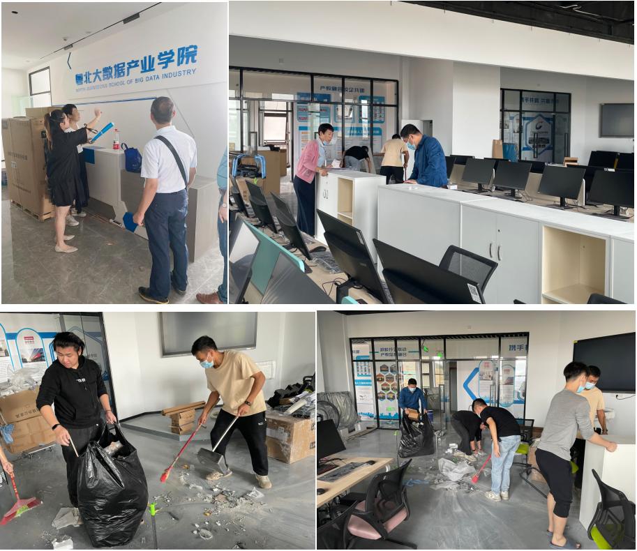 搬迁完成后,学院领导、机房管理员来到粤北大数据产业学院,查看产业学院项目进度,并与学生一起整理场地、清洁卫生,确保产业学院实践教学顺利开展。