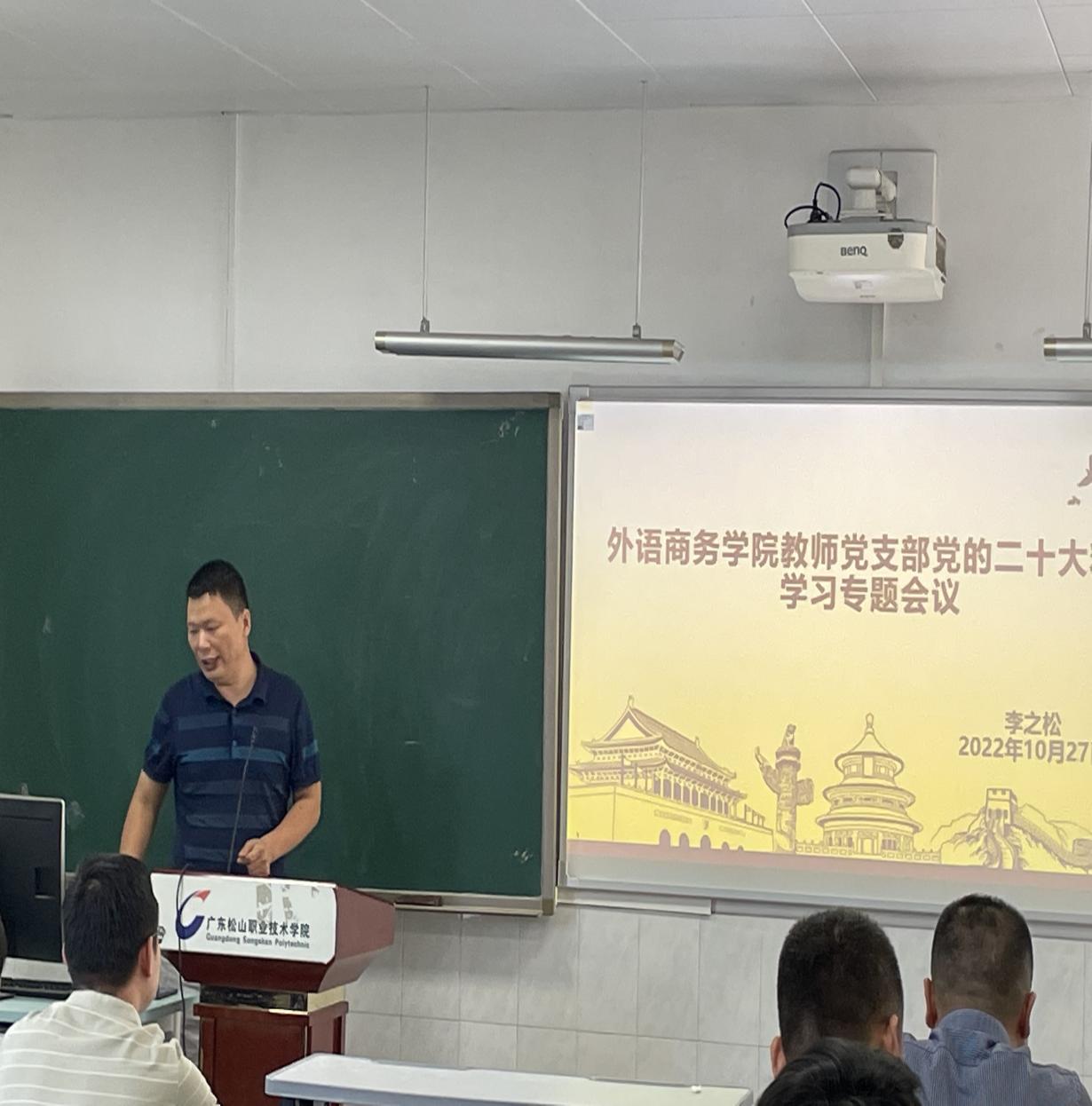 10月16日,中国共产党第二十次全国代表大会在北京隆重开幕,外语商务学院教师党支部于当日组织开展了“观看开幕盛况 体悟大会精神 凝聚奋进力量”的主题党日活动,学院二十余名教师党员,身着正装,庄严肃穆,齐聚一堂,集中观看大会直播盛况,领会大会精神,凝聚奋进力量。10月27日下午,为了进一步深入学习贯彻党的二十大精神,教师党支部组织开展了党的二十大精神专题学习会。学习会由支部书记李之松领学。