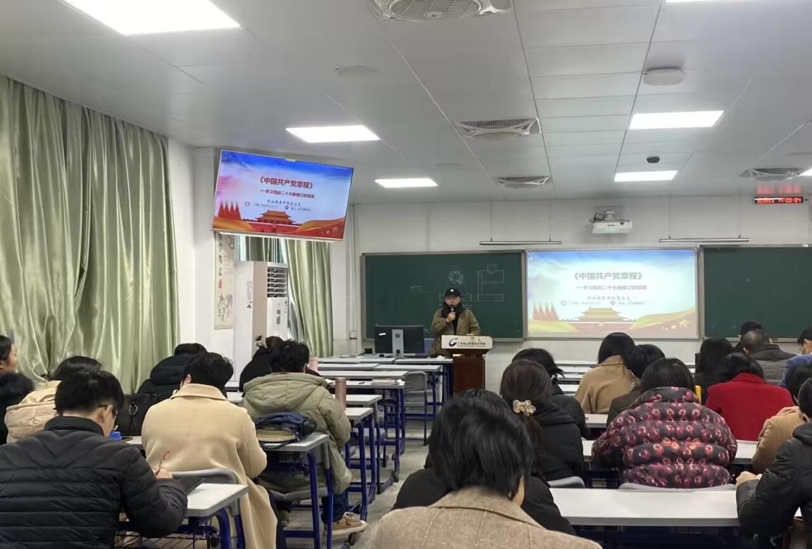 为持续掀起学习贯彻落实党的二十大精神热潮,进一步提高广大党员的党性觉悟,引导教育广大教师认真学习党章、严格遵守党章、坚决贯彻党章、严肃维护党章,不断提高党组织的凝聚力、号召力和战斗力,12月1日下午,外语商务学院党总支开展专题党课认真学习党的二十大新修订的《中国共产党章程》,党课由外语商务学院党总支书记高贺主讲,全院党员教师参会。