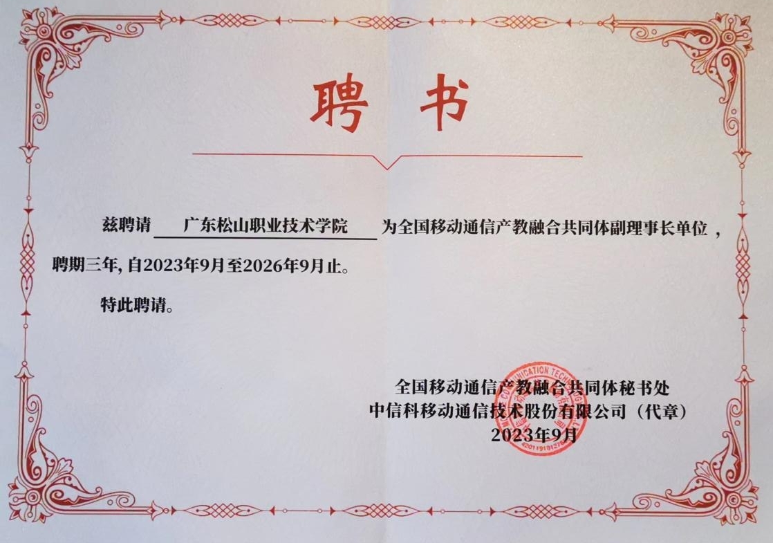我校受聘全国移动通信产教融合共同体副理事长单位聘书