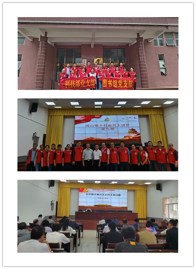 主题党日活动期间,应油山镇党委、驻镇帮镇扶村工作队邀请,郭展义博士在油山镇人民政府会堂作题为《油山镇乡村振兴大讲堂——乡村振兴重点及农村主要问题》的专题讲座。郭博士的讲演精彩纷呈,油山大会堂内不时响起阵阵掌声,一个多小时的讲演在郭博士即兴演唱的一首红歌《永远跟党走》中落下帷幕,听众意犹未尽,收获颇丰。