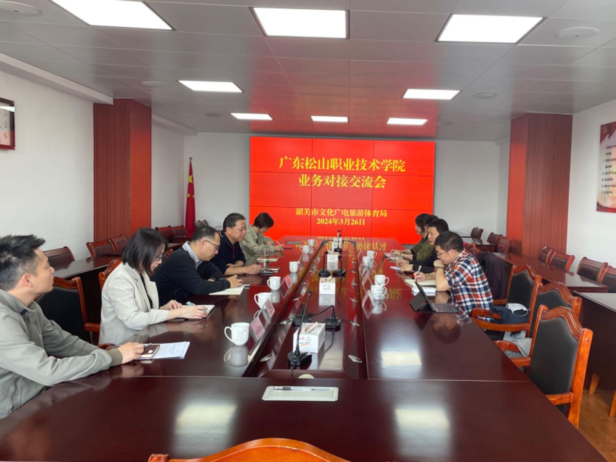 为进一步落实我校与韶关市文化广电旅游体育局(以下简称“市文广旅体局”)签署的战略合作备忘录内容,推动政校合作,3月26日,外语商务学院副院长李之松带领教师团队赴市文广旅体局召开业务对接交流会。市文广旅体局副局长朱伙新、副局长梁成斌及各科室负责人参加交流会议。