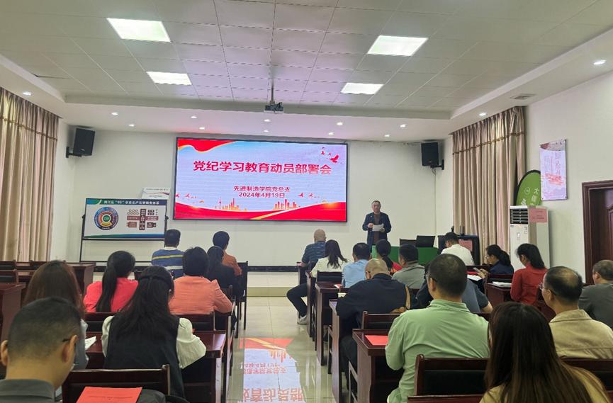 先进制造学院党总支书记赵保宁传达学习了习近平总书记关于开展党纪学习教育的重要讲话和重要指示精神以及学校党委关于党纪学习教育的工作部署,重点解读了党纪学习教育目标要求、重要意义、学习重点、工作要求等具体内容,并部署学院党纪学习教育工作。