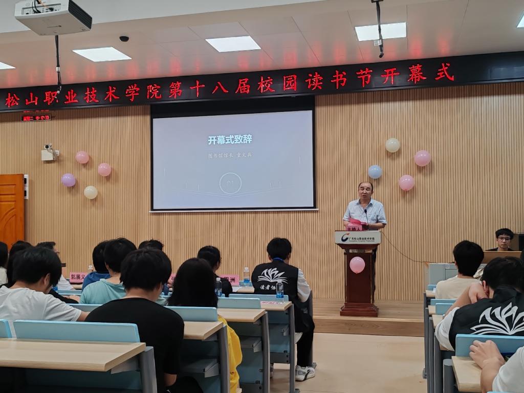 4月23日晚,我校第十八届校园读书节开幕式在厚C101举行。图书馆馆长童文兵、副馆长郭展义,校团委副书记曾庆宇出席开幕式,教师代表、社团代表及100余名读者参加开幕式。开幕式由图书馆读者服务部部长潘有娣主持。