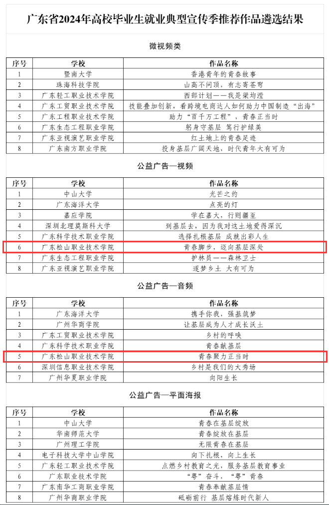 近日,广东省教育厅下发《广东省教育厅办公室关于公布2024年高校毕业生就业典型宣传季推荐作品遴选结果的通知》,我校2项公益广告作品:《青春脚步,迈向基层深处》(学生:曾柳青、骆振航、姚浩添、杜家汉;指导老师:罗葳、李媛媛、王玉贤)、《青春聚力正当时》(学生:曾柳青;指导老师:杨璐瑶)荣获省教育厅报送教育部参加全国层面的遴选。