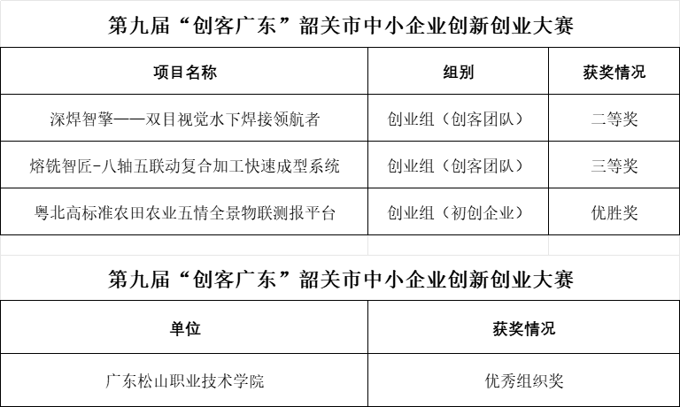 7月15日,第九届“创客广东”韶关市中小企业创新创业大赛颁奖典礼举行。广东松山职业技术学院创新创业学院推荐团队以强劲实力创下参赛历史最佳成绩——斩获二等奖1项、三等奖1项、优胜奖1项。其中,张攀峰博士团队的“深焊智擎——双目视觉水下焊接领航”项目以第二名成绩代表韶关出征省赛;学校获评“优秀组织奖”,为双创教育再添标志性成果。