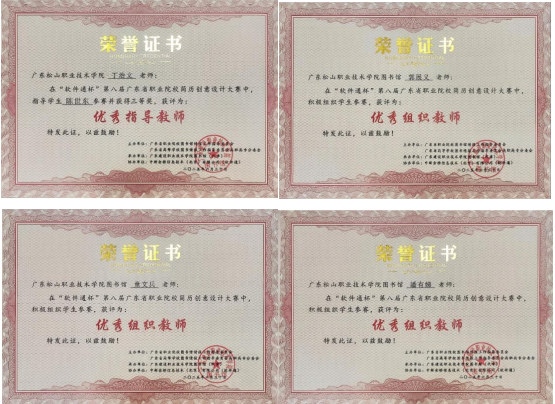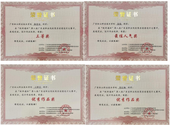 在“软件通杯”第八届广东省职业院校简历创意设计大赛中,我校学子积极报名参加,结合自身特长专长,在简历内容、外观设计、效果呈现等多方面完善参赛作品。最终,陈世东同学荣获“三等奖”,周红梅、王梓宏2位同学荣获“优秀作品奖”,翁炀同学荣获“最佳人气奖”,图书馆荣获“优秀组织奖”,丁治文老师荣获“优秀指导教师奖”,童文兵、郭展义、潘有娣等3位老师荣获“优秀组织教师奖”。