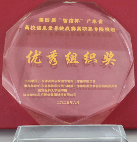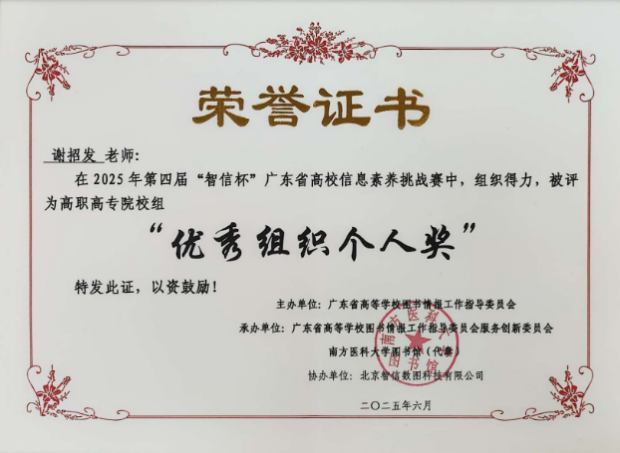在第四届“智信杯”广东省高校信息素养挑战赛中,我校170余名同学积极参加初赛,激烈角逐后共有6名选手取得决赛资格。最终,我校刘朱志鹏同学荣获高职高专院校组“优秀奖”。图书馆荣获高职高专院校组“优秀组织奖”,谢招发老师荣获高职高专院校组“优秀组织个人奖”。