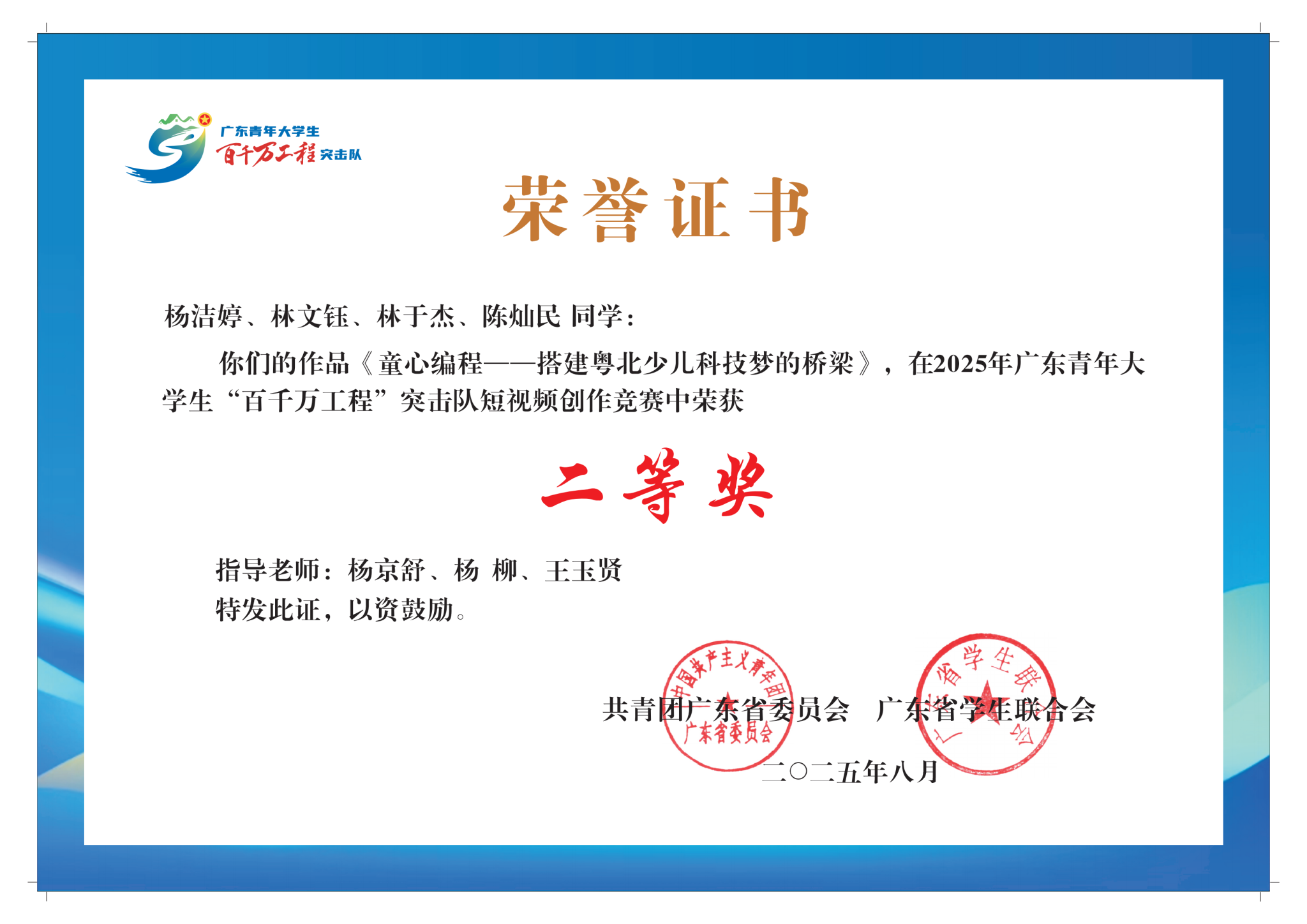 近日,由共青团广东省委员会、广东省学生联合会主办,广东财经大学承办的广东青年大学生“百千万工程”突击队短视频创作竞赛结果正式公布。由我校计算机与信息工程学院学生杨洁婷、林文钰、林于杰、陈灿民等共同创作的作品《童心编程——搭建粤北少儿科技梦的桥梁》(指导教师:杨京舒、杨柳、王玉贤)荣获大赛二等奖。