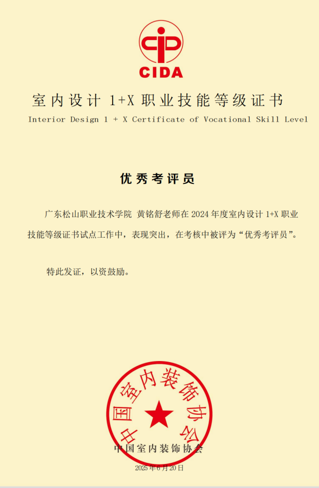 近日,中国室内装饰协会公布2024年度室内设计“1+X”职业技能等级证书试点工作评优结果。我校计算机与信息工程学院王影老师获评“优秀院校教师”称号、黄铭舒老师获评“优秀考评员”称号。这不仅是对两位教师个人专业能力和教学水平的充分肯定,更是学院积极推进“1+X”证书制度试点工作、深化教育教学改革的重要成果体现。