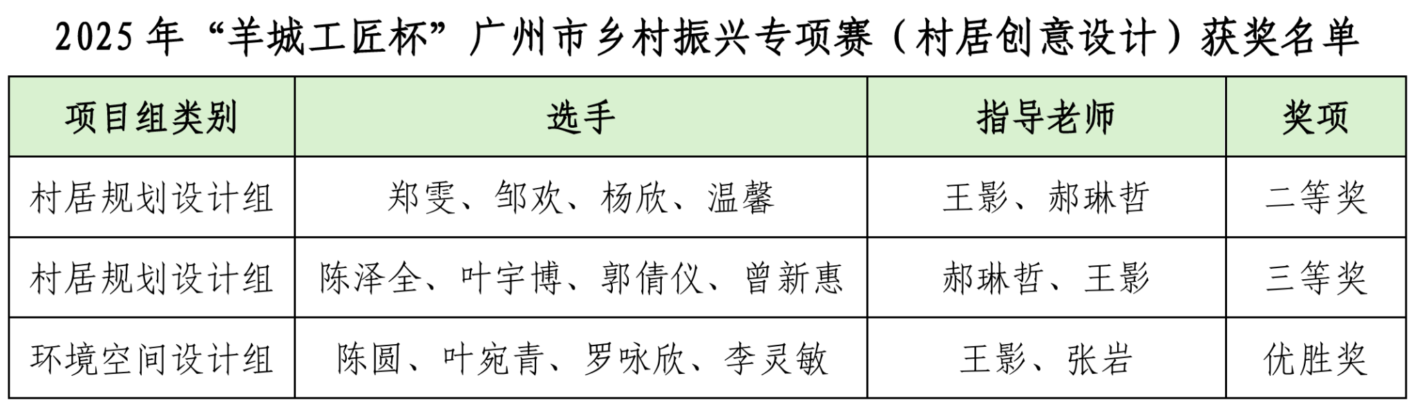 10月23日至24日,由广州市总工会主办、广州市南沙区总工会承办、广州市装饰艺术行业协会执行实施的2025年“羊城工匠杯”广州市乡村振兴专项赛(村居创意设计)决赛在广州市南沙区成功举行,我校计算机与信息工程学院室内艺术设计专业师生取得卓越成绩。由王影、郝琳哲、张岩等老师指导的3个团队分别获得二等奖1项、三等奖1项、优胜奖1项,学校荣获“优秀组织奖”“优秀培育奖”!