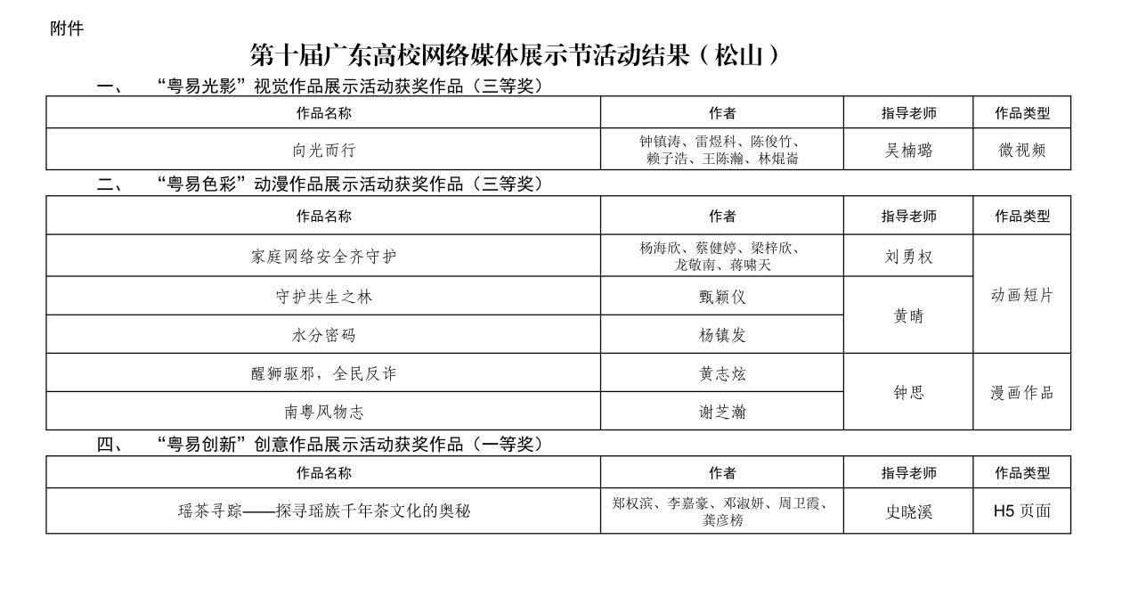 近日,广东省教育厅公布了第十届广东高校网络媒体展示节活动结果。我校师生在本届展示节中表现优异,荣获一等奖1项、三等奖4项,充分展现了我校网络文化建设的丰硕成果和师生的创新活力。