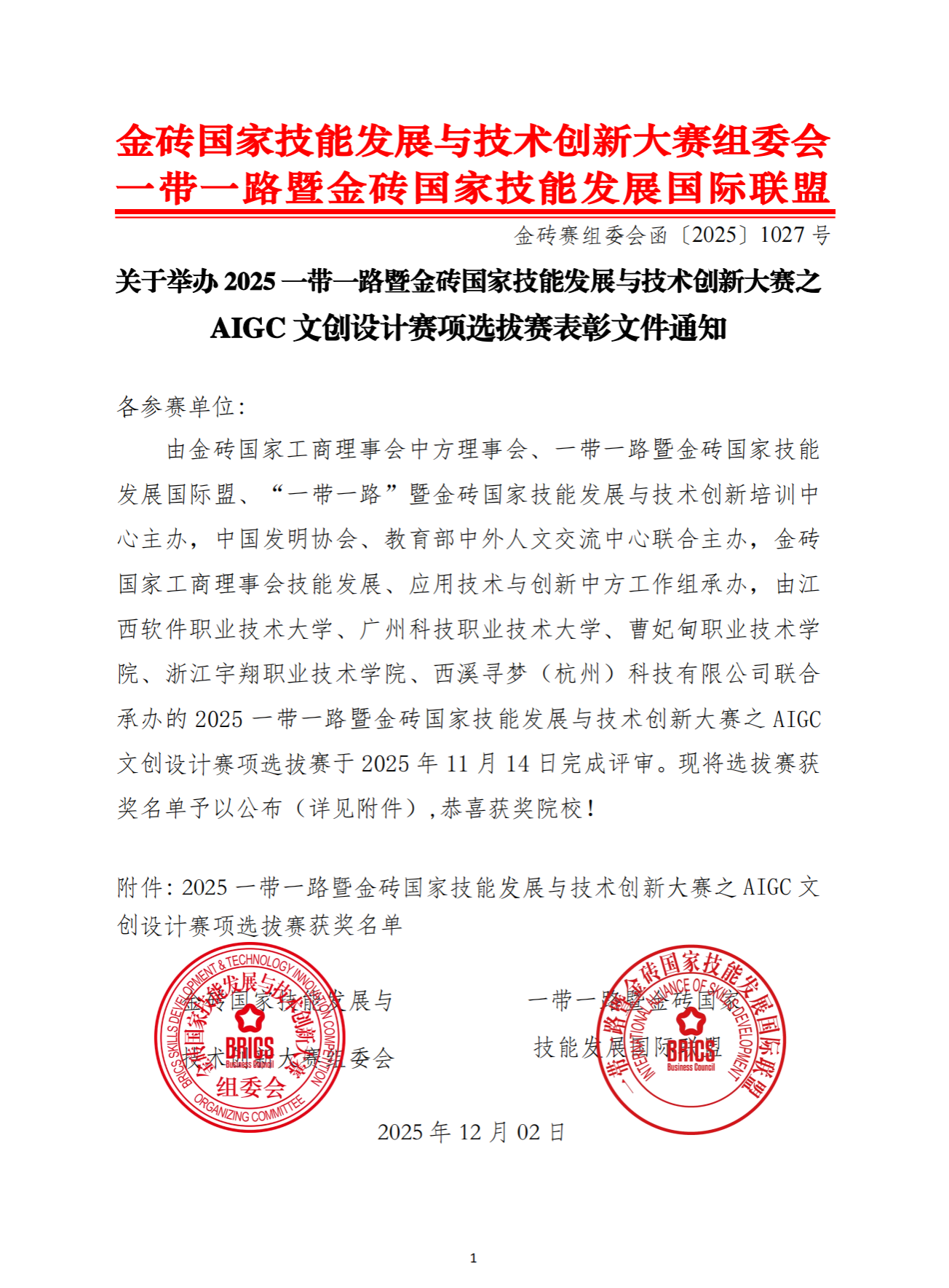 近日,由金砖国家工商理事会中方理事会、一带一路暨金砖国家技能发展国际联盟、“一带一路”暨金砖国家技能发展与技术创新培训中心主办,中国发明协会、教育部中外人文交流中心联合主办的“2025一带一路暨金砖国家技能发展与技术创新大赛之AIGC文创设计赛项选拔赛”获奖名单公布。由计算机与信息工程学院数字媒体技术专业教师曾万隆、李媛媛、罗葳指导的学生作品荣获二等奖3项、三等奖8项、优秀奖1项。