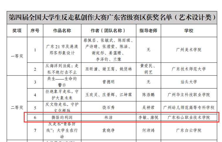 在第四届全国大学生反走私创作大赛广东省级赛区评选中,我校学生林洁作品《撕裂的利润》荣获二等奖,李敏、康悦荣获“优秀指导教师”称号。学校因组织有力、参与积极,被授予“优秀组织奖”。此次获奖不仅是对学子创作能力与社会责任感的肯定,也彰显了我校在反走私宣传教育工作中的扎实成效,引导广大青年学生增强法治意识,自觉抵制走私行为。