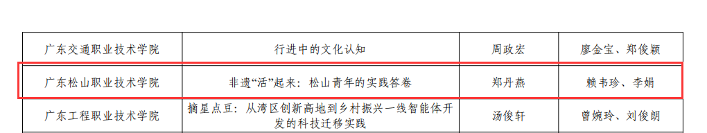 在“研习南粤”2025年暑期教育实践活动中,我校作品《非遗“活”起来:松山青年的实践答卷》(学生郑丹燕,指导教师:赖韦珍、李娟)凭借对非遗文化传承的深入探索与创新实践,成功获评优秀实践项目。该项目展现了我校学子聚焦地方文化传承、主动担当青年责任的良好风貌,也体现了我校在非遗保护与实践教学融合方面的积极探索。