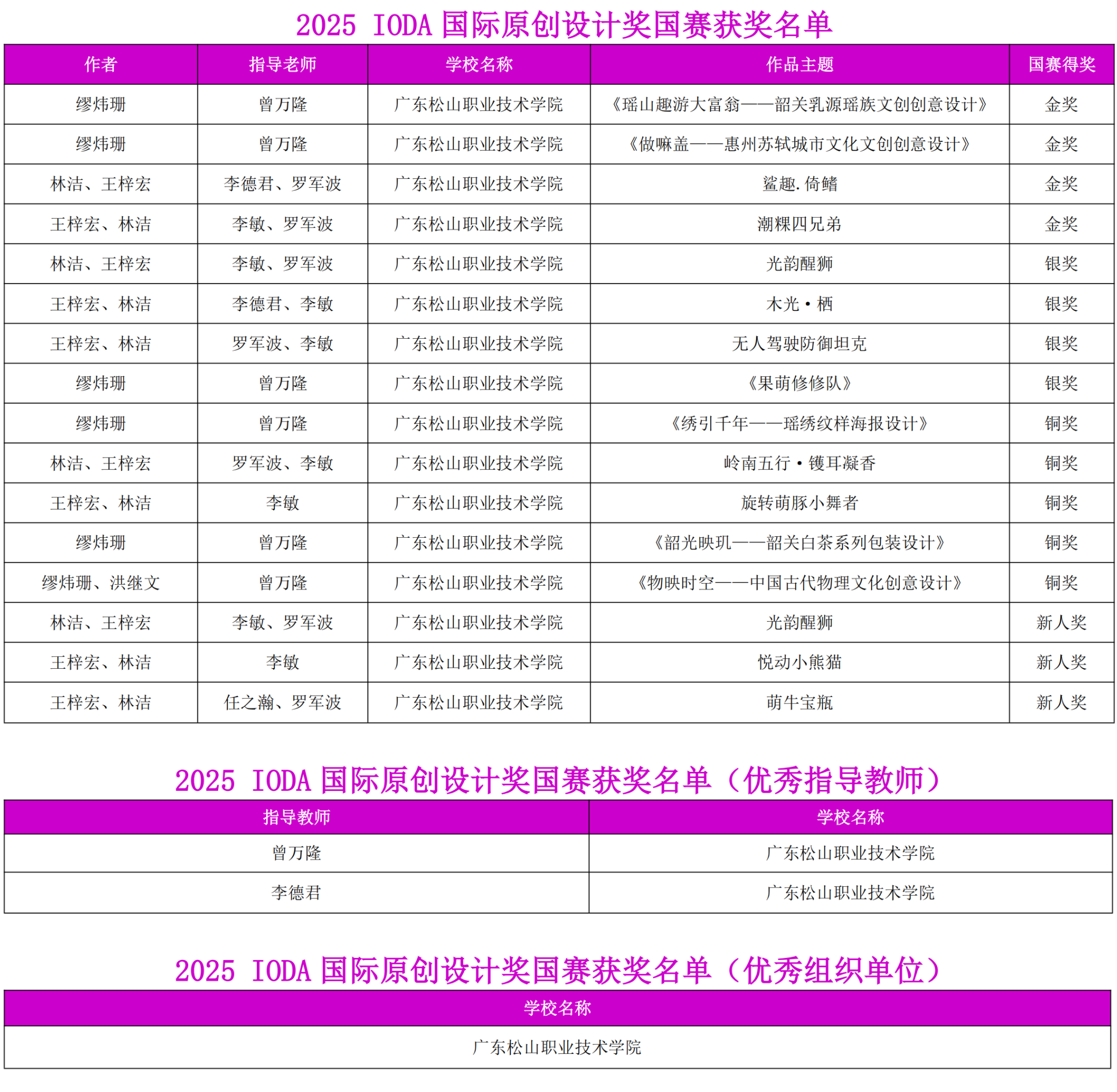 近日,2025IODA国际原创设计奖国赛获奖名单公示。计算机与信息工程学院数字媒体技术专业群教师曾万隆、李德君、罗军波、李敏、任之瀚指导的学生作品共获得金奖4项、银奖4项、铜奖5项、新人奖3项。教师曾万隆、李德君荣获“优秀指导教师”称号,我校获评“优秀组织单位”。