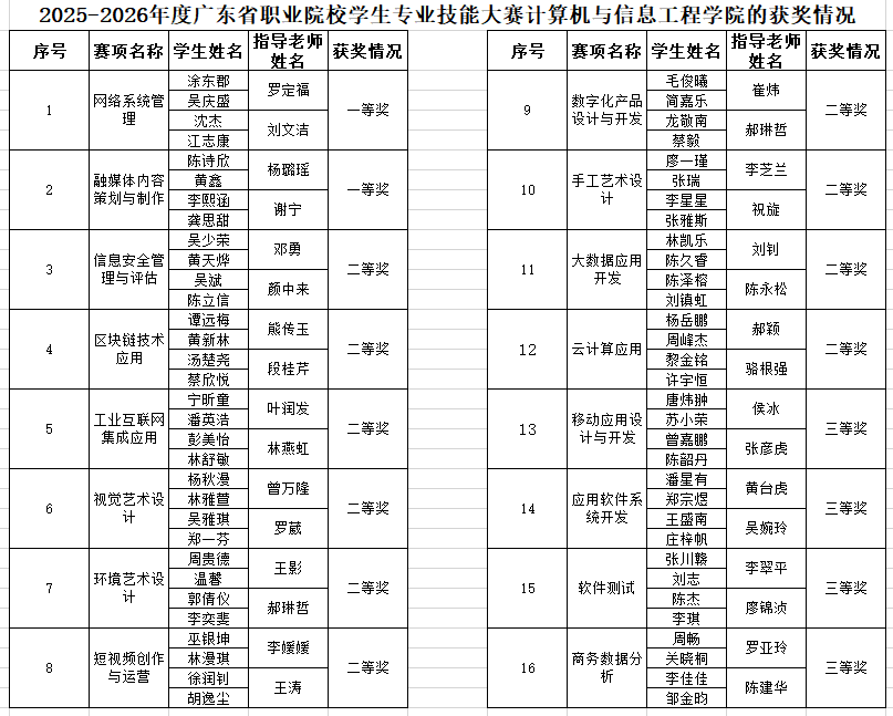 近日,2025-2026学年广东省职业院校技能大赛各赛项圆满落幕。计算机与信息工程学院师生团队在激烈的角逐中表现卓越,共斩获一等奖2项、二等奖10项、三等奖4项,获奖总数达16项,参赛师生以扎实的专业功底、精湛的实操技能和默契的团队协作,充分展现了学院高素质技术技能人才培养的显著成效。