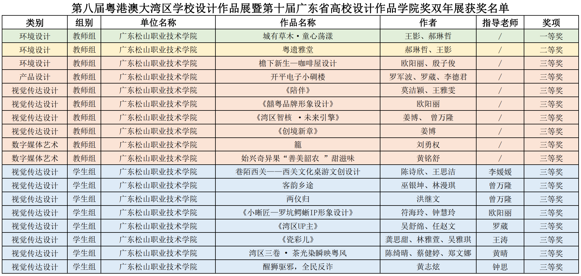 近日,由广东省教育厅主办、广东外语外贸大学承办的第八届粤港澳大湾区学校设计作品展暨第十届广东省高校设计作品学院奖双年展公示了获奖名单,我校师生获得教师组一等奖1项、二等奖1项、三等奖8项;学生组三等奖8项,获奖数量再创历史新高!