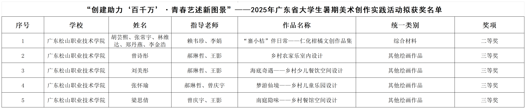 在2025年广东省大学生暑期美术创作实践活动中,组委会从全省115所高校报送的1374件作品中,评选出获奖作品448项。我校5件作品脱颖而出,充分体现了学校在美术创作实践领域的持续投入与育人成效,展示了松山青年学子深入生活、扎根人民,用艺术语言讲述时代故事,展现乡村振兴与湾区发展的生动图景。