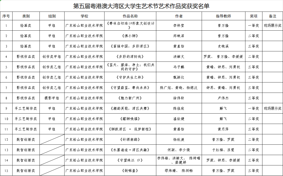 在第五届粤港澳大湾区大学生艺术节中,全省共评选出获奖作品1643件。经专家评审及公示,我校共有15件作品获奖,其中6位教师荣获优秀指导教师奖,2件作品获现场优秀展示奖,成绩斐然。此次艺术节旨在推动粤港澳大湾区高校文化共建、艺术传承与创新,我校师生以饱满的创作热情和扎实的艺术功底,积极参与大湾区文化艺术交流,展现了新时代松山青年对国家发展、湾区建设的责任与使命感。