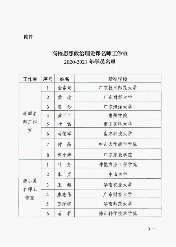 近日,广东省教育厅下发了《关于公布高校思想政治理论课名师工作室2020-2021年学员名单的通知》(粤教思函[2020]5号),通报全省高校思政课名师工作室入围学员名单,我校思政部张丹丹老师作为学员顺利入选“李霞名师工作室”,将在该工作室进行为期2年的非脱产学习。