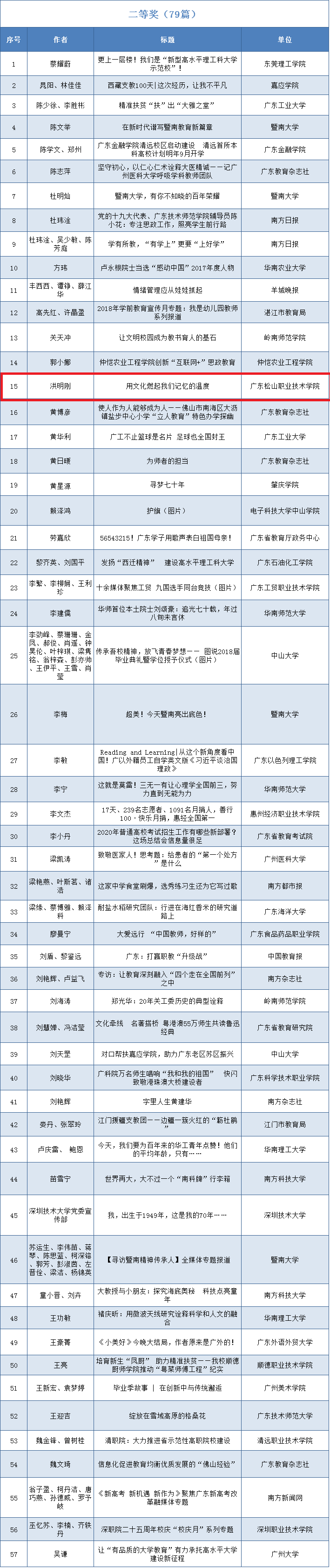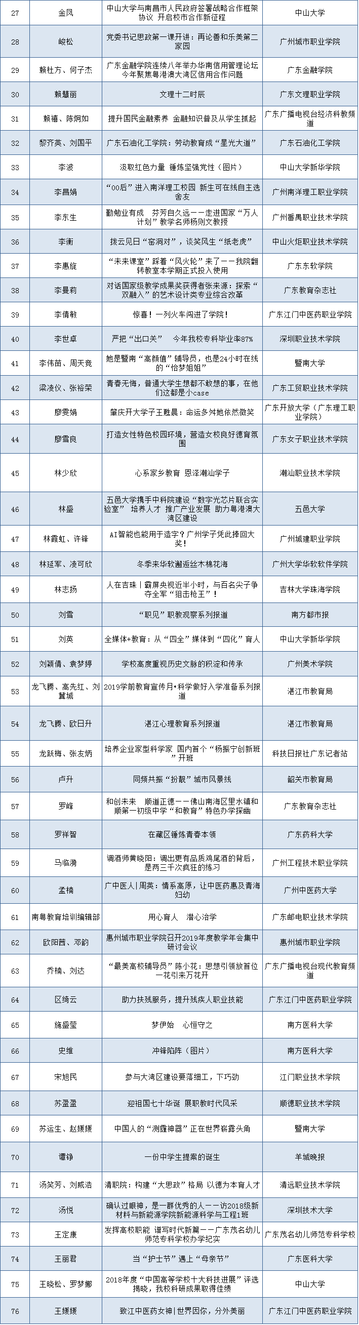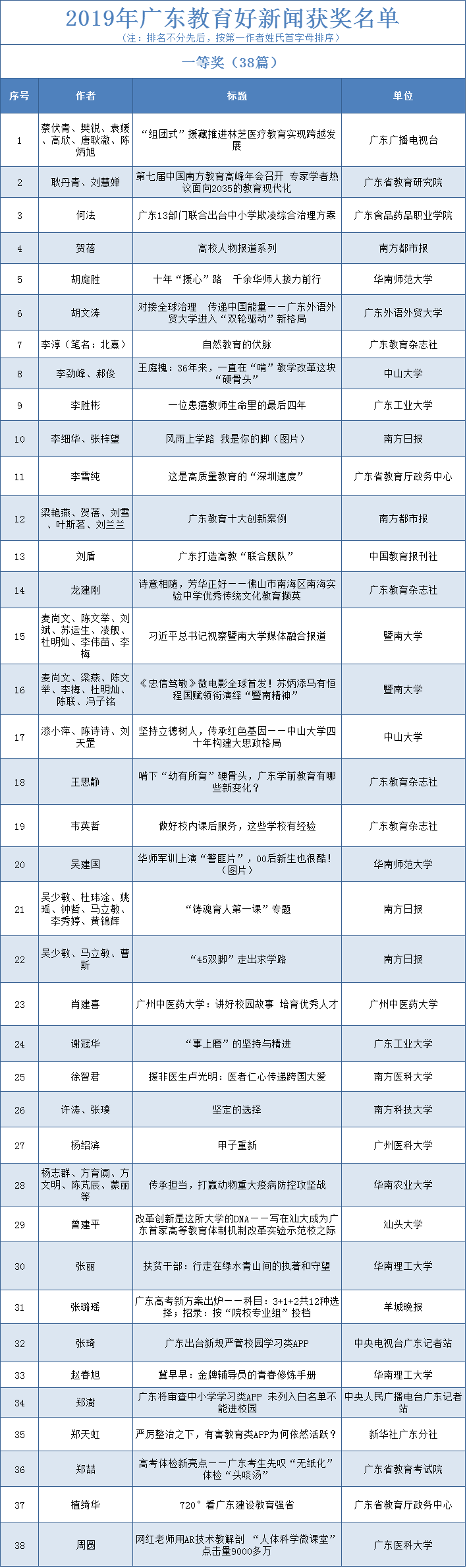 2019年广东教育好新闻评选活动自2019年9月启动,各地教育部门、各普通高校及相关媒体积极参与,共收到作品800余篇。经专家、学者组成的评委会评定,评选出一等奖作品38篇,二等奖作品79篇,三等奖作品115篇。