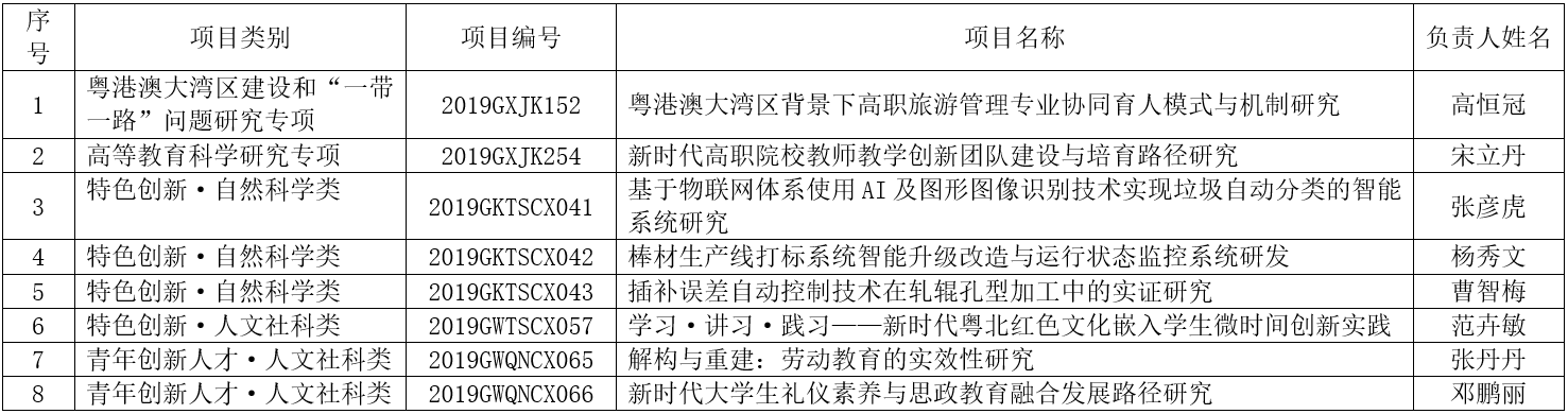 近日,根据《广东省教育科学规划领导小组办公室关于公布广东省教育科学“十三五”规划2019年度高校哲学社会科学专项研究项目立项名单的通知》和《广东省教育厅关于公布2019年度普通高校认定类科研项目立项名单的通知》,经学校初审遴选及推荐,省教育厅评审或认定,我校8个项目获准立项,其中,粤港澳大湾区建设和“一带一路”问题研究专项1项,高等教育科学研究专项1项;特色创新·自然科学类项目3项,特色创新·人文社科类项目1项;青年创新人才·人文社科类项目2项。立项名单详见下表。