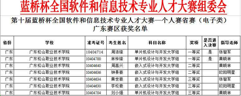 电气工程系历来高度重视学生的学科竞赛工作。为备战本届“蓝桥杯”省赛,赛前为参赛队伍提供良好的训练环境,选派优秀的骨干教师对参赛学生进行赛前悉心指导,参赛学生们刻苦训练,功夫不负有心人,最终取得了喜人成绩,以精湛技艺在全省其他高校前展现出我院学子的良好精神风貌。参赛选手的优秀表现为松山学子树立了好榜样,激发了广大学子的学习热情!优异成绩的取得充分展示了电子信息工程技术专业的教学成果,扩大了学校知名度。