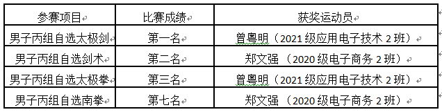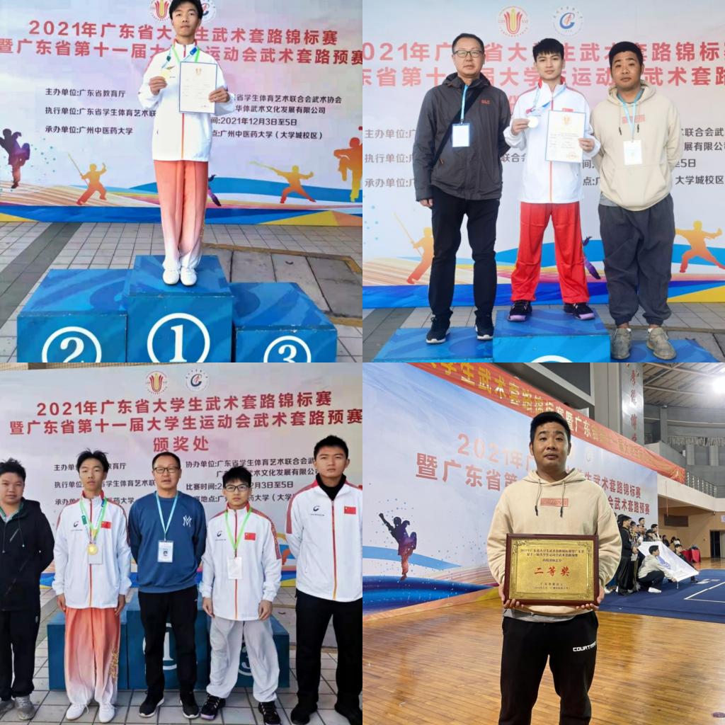 12月3日至5日,由广东省教育厅主办的“2021年广东省大学生武术套路锦标赛”在广州中医药大学举行。我校武术队在教练员肖杰、刘黄华的指导下,勇夺男子丙组自选太极剑单项第一名、男子丙组自选剑术单项第二名、男子丙组自选太极拳单项第三名、男子丙组自选南拳单项第七名和团体总分二等奖的好成绩,肖杰、刘黄华荣获“优秀教练员”称号。