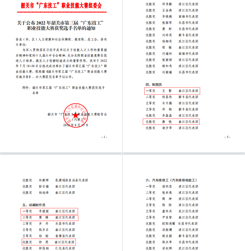 近日,在市人社局、市教育局、市总工会共同举办的2022年韶关市第三届“广东技工”职业技能大赛(以下简称“大赛”)中,计算机与信息工程学院教师在制图员与动画制作员项目竞赛中喜获佳绩。其中,王影、李媛媛分别获得制图员与动画制作员项目一等奖,康悦获得制图员项目优胜奖,黄晴、钟思分别获得动画制作员项目二等奖、优胜奖。