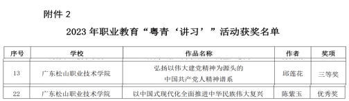 近日,我校马克思主义学院邱莲花和陈紫玉两位老师在2023年职业教育“粤青‘讲习’”活动中分获“三等奖”和“优秀奖”。