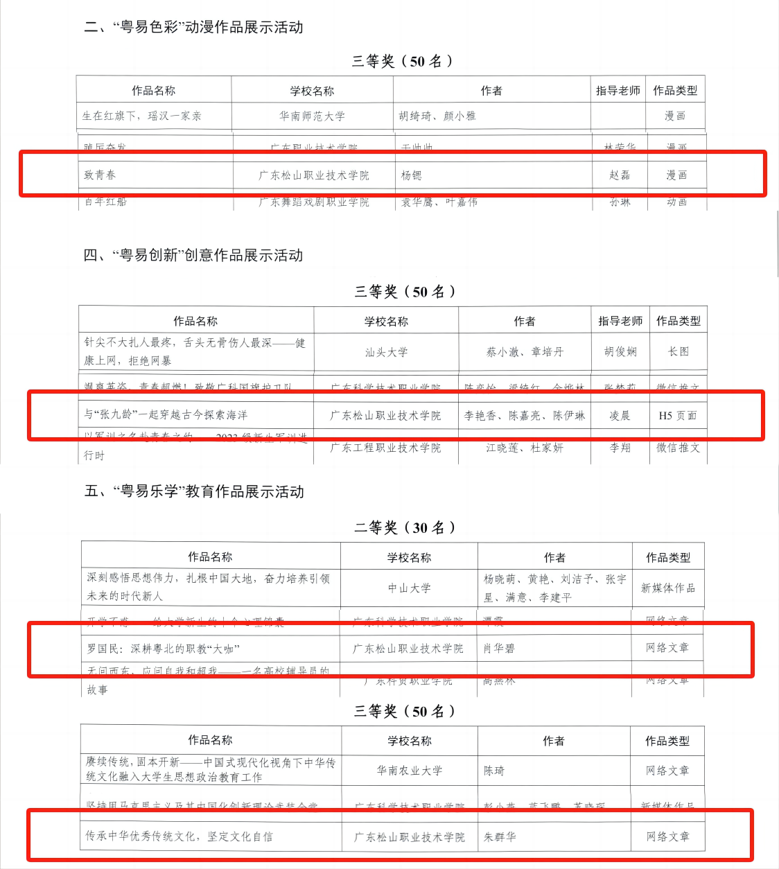 近日,由广东省教育厅主办的第八届广东高校网络媒体展示节活动评选结果公布,我校共获得二等奖1项、三等奖3项。其中,肖华碧老师的网络文章《罗国民:深耕粤北的职教“大咖”》荣获“粤易乐学”教育作品二等奖,朱群华老师的网络文章《传承中华优秀传统文化,坚定文化自信》荣获“粤易乐学”教育作品三等奖,杨锶同学的漫画作品荣获“粤易色彩”动漫作品三等奖,李艳香、陈嘉亮、陈伊琳同学的新媒体作品《与“张九龄”一起穿越古今探索海洋》荣获“粤易创新”创意作品三等奖。