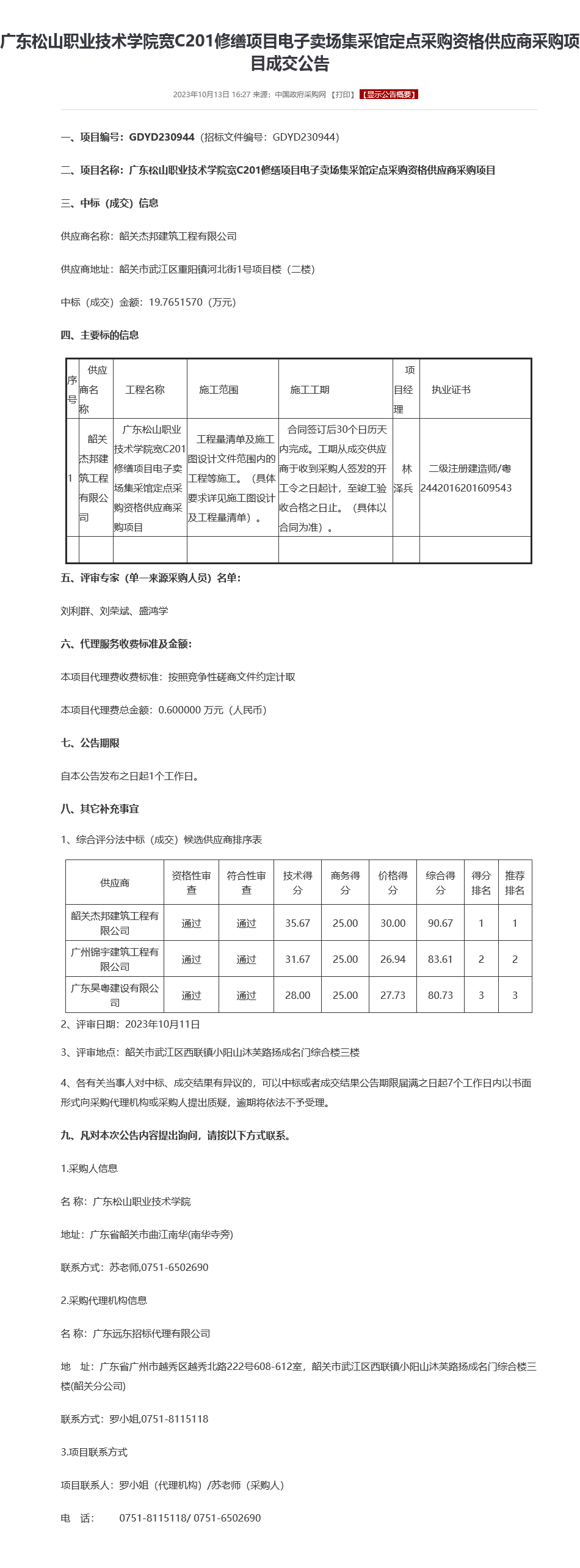 上一条:【校内采购公告】2024年和2025年中文纸质期刊询价公告 下一条:【采购公告】广东松山职业技术学院宽C201修缮项目电子卖场集采馆定点采购资格供应商采购项目竞争性磋商公告