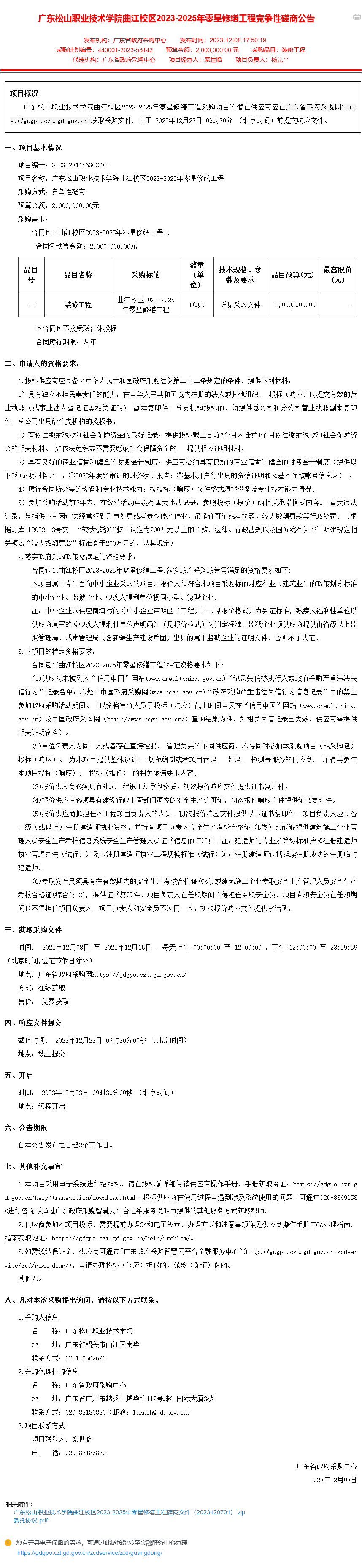 上一条:【中标(成交)结果公告】2024-2025年教职工生日慰问品(蛋糕券)采购成交结果公告 下一条:【采购公告】广东松山职业技术学院浈江校区2023-2025年零星修缮工程竞争性磋商公告