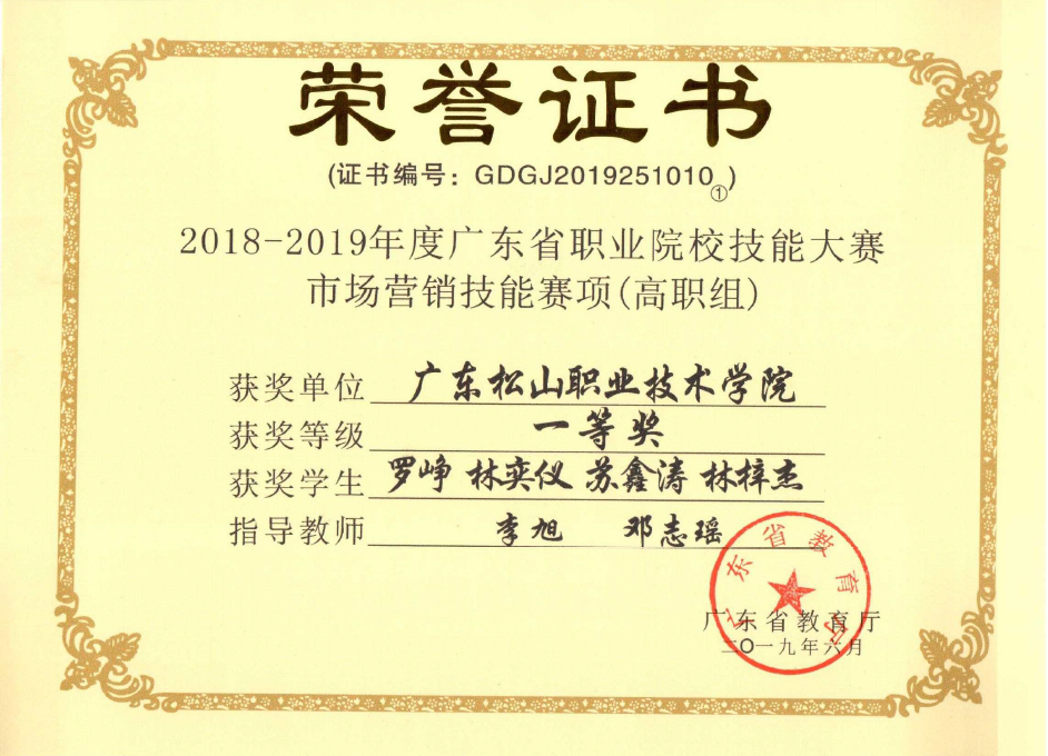 上一条:2.2.2 全国大学生外贸从业能力大赛POCIB 三等奖(2项) 下一条:2.2.4 2017-2018年度广东省职业院校技能大赛市场营销赛项 二等奖